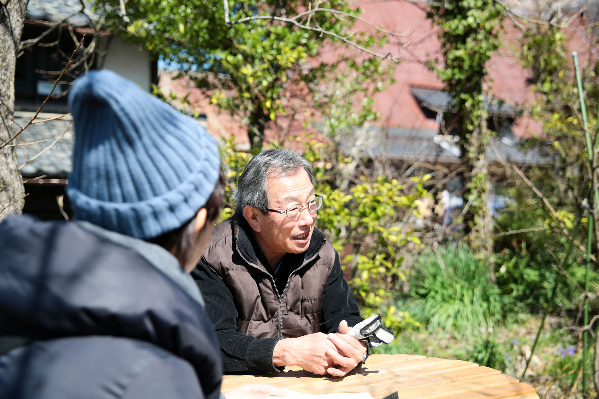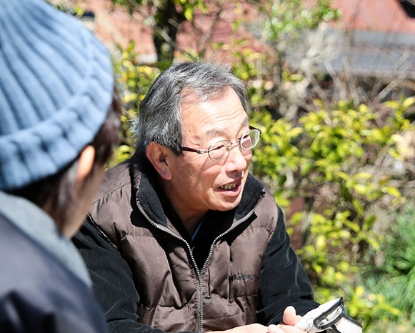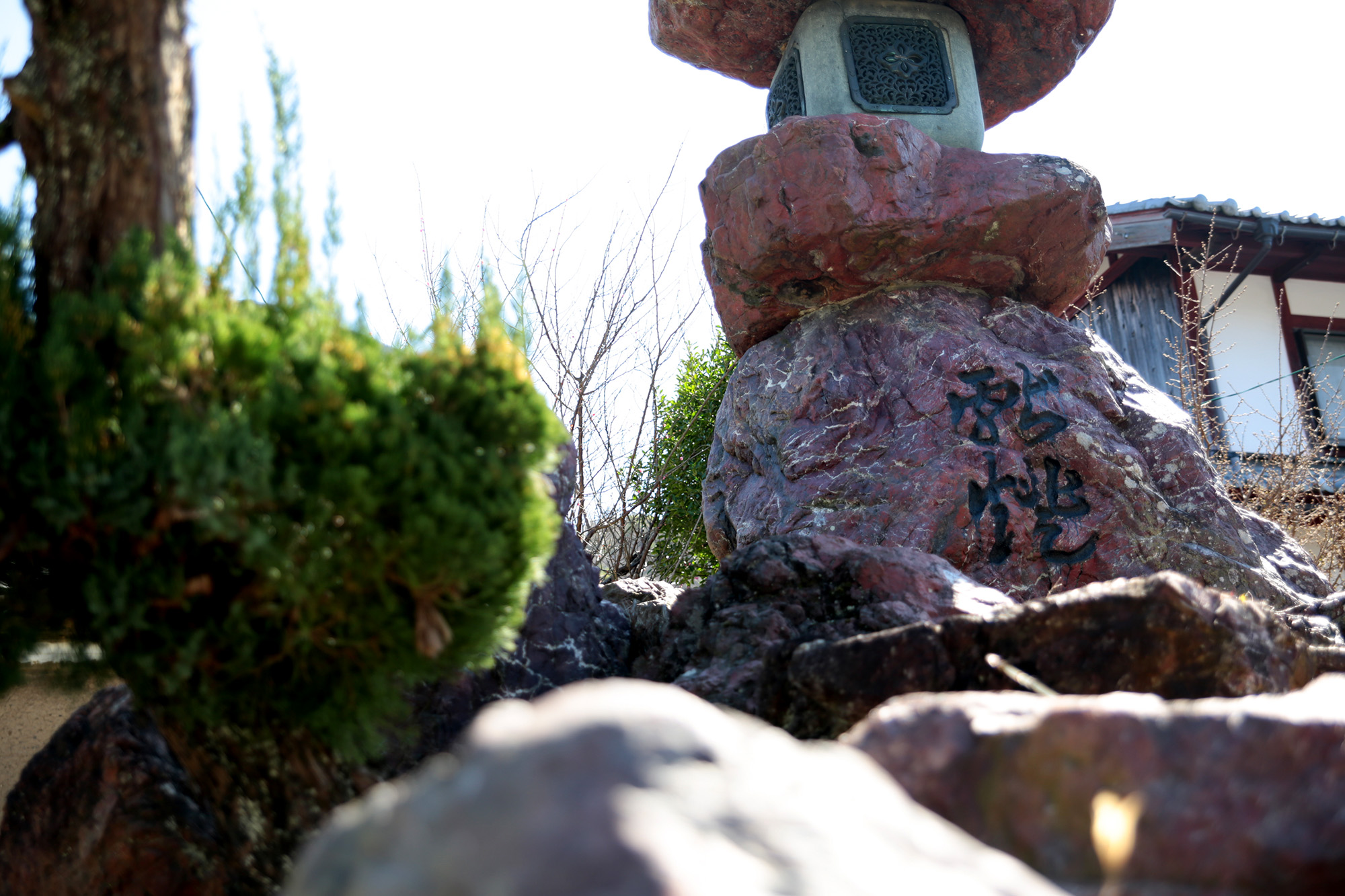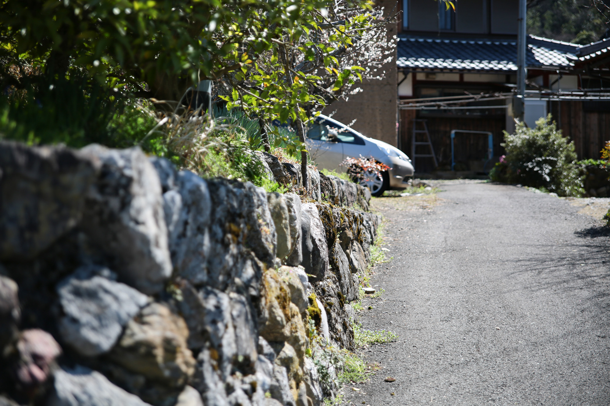 まず目に飛び込んでくるのが、家の右手前にある「赤石の灯篭」。集落のお宮さんのものであるが、地元産の赤石を使った大灯篭だ。この家の通りは昔、集落の中心地であったとのこと。地域の集いの場、目印であった歴史が伺える。家へのアプローチを進む間にも、ソメイヨシノや柿等、いろいろな樹木がお出迎え。取材に向かった3月中旬、もうソメイヨシノが咲いていた。庭で、季節を体感できるということ。とても贅沢で豊かだと思う。庭の樹木は大家さんが植樹し、いまも四季折々楽しめる庭になっている。この庭は、畑にしてもいいし、別の場所にも畑があるので、そちらもどうぞとのこと。至れりつくせり。