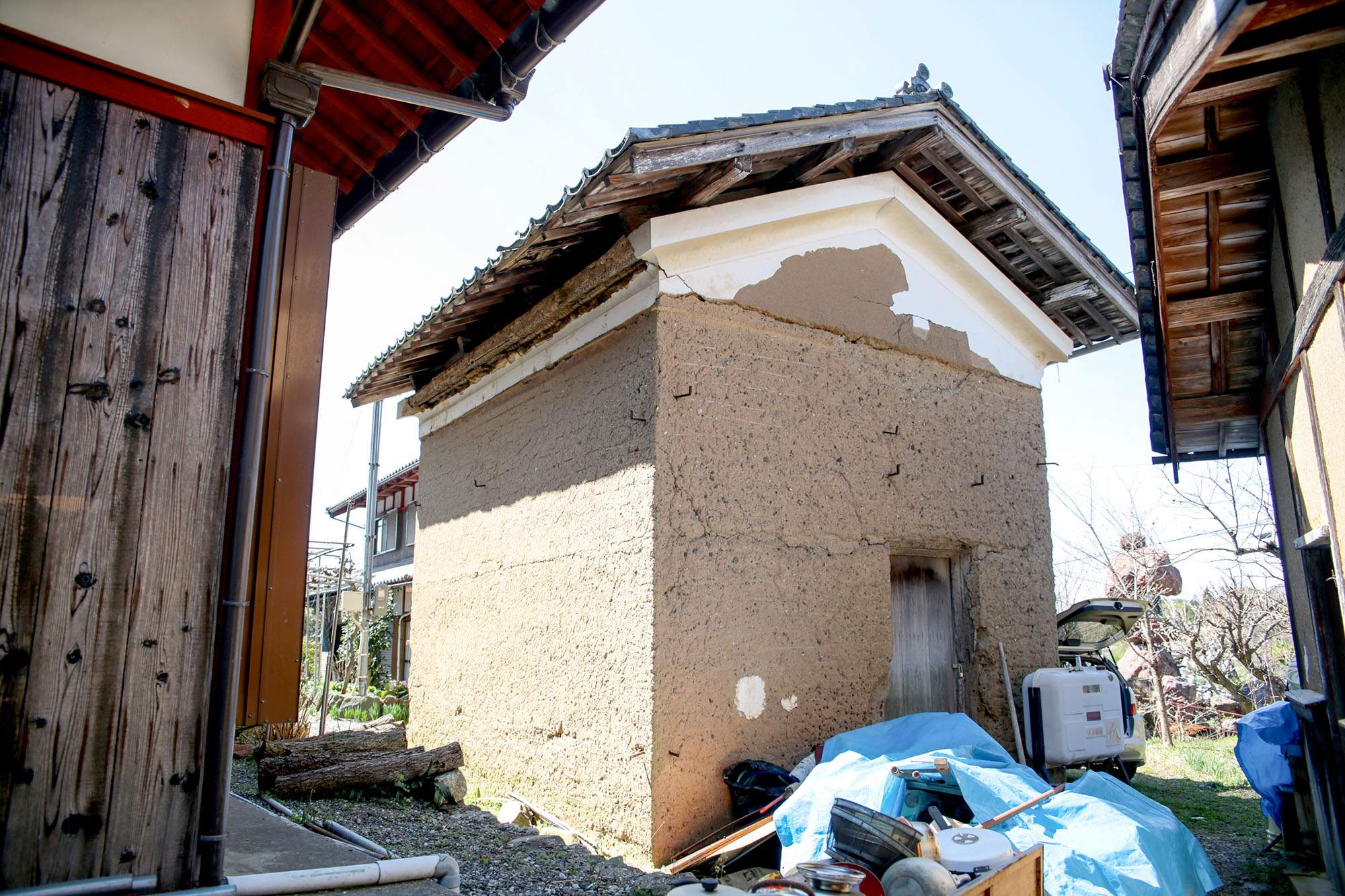 蔵は、母屋の右隣。土壁で、中はひんやりとしている。モノを保存するには最適な環境で、大きなナガモチが3個も入っていて、着物や紋付袴等がゆっくりと休んでいた。立派な桐たんすや冠婚葬祭用の漆器や食器、食膳もたくさん。家の、地域の行事の伝統や歴史が、ぎゅうっと詰まった蔵。
